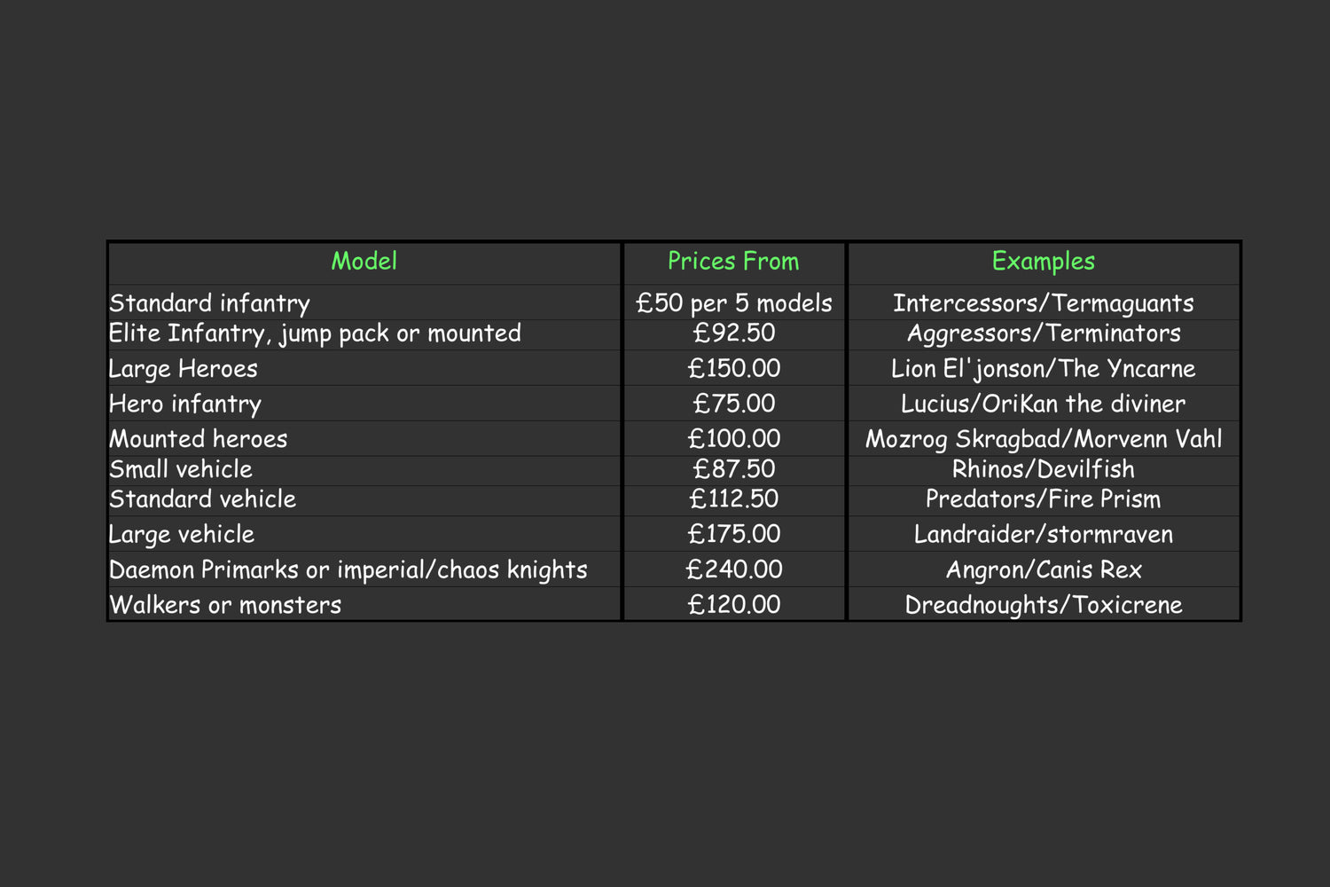 All prices include supply of miniatures, building, mould lines removed, barrels drilled and basic basing. Additional extras include decals, more advanced base style, weathering effects and using third party Components which we can source or customer supplied. There will be a additional discount on larger projects. All commission work will on an individual quote basis to your specifications. We aim to complete projects between 2 to 4 weeks on arrival of models, this will be longer on bigger projects or during busy periods. This is not limited to just Warhammer, we also offer commission painting service for any miniatures for D&D to 3D printed models.